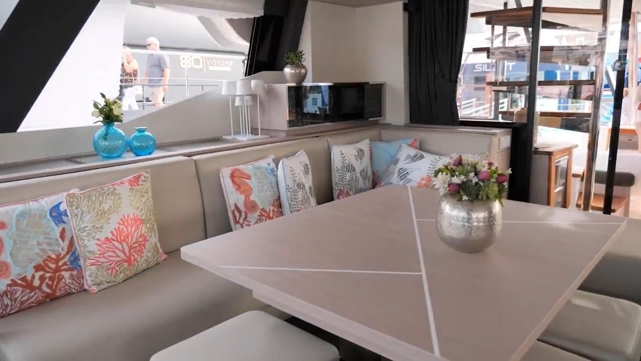 Kühlschrank (1x90Lt + 1x130Lt), Gefrierschrank (2x90L), Waschmaschine, Geschirrspülmaschine, Backofen, Kombüse, TV System (), TV Antenne, DVD - Player, CD - Player, Lautsprecher im Cockpit, Elektrische Toilette (7), Meerwasserpumpe, Elektrische Bilgepumpe, Manuelle Bilgenpumpe, Kompressor, Espresso Kaffeemaschine, Kissen (), Jalousiene für Decksluken, Skipperkabine (2), Teppich (), Eismaschine, Raffrollos, Weinkühler, 3-fach verstellbarer Dinettentisch ()