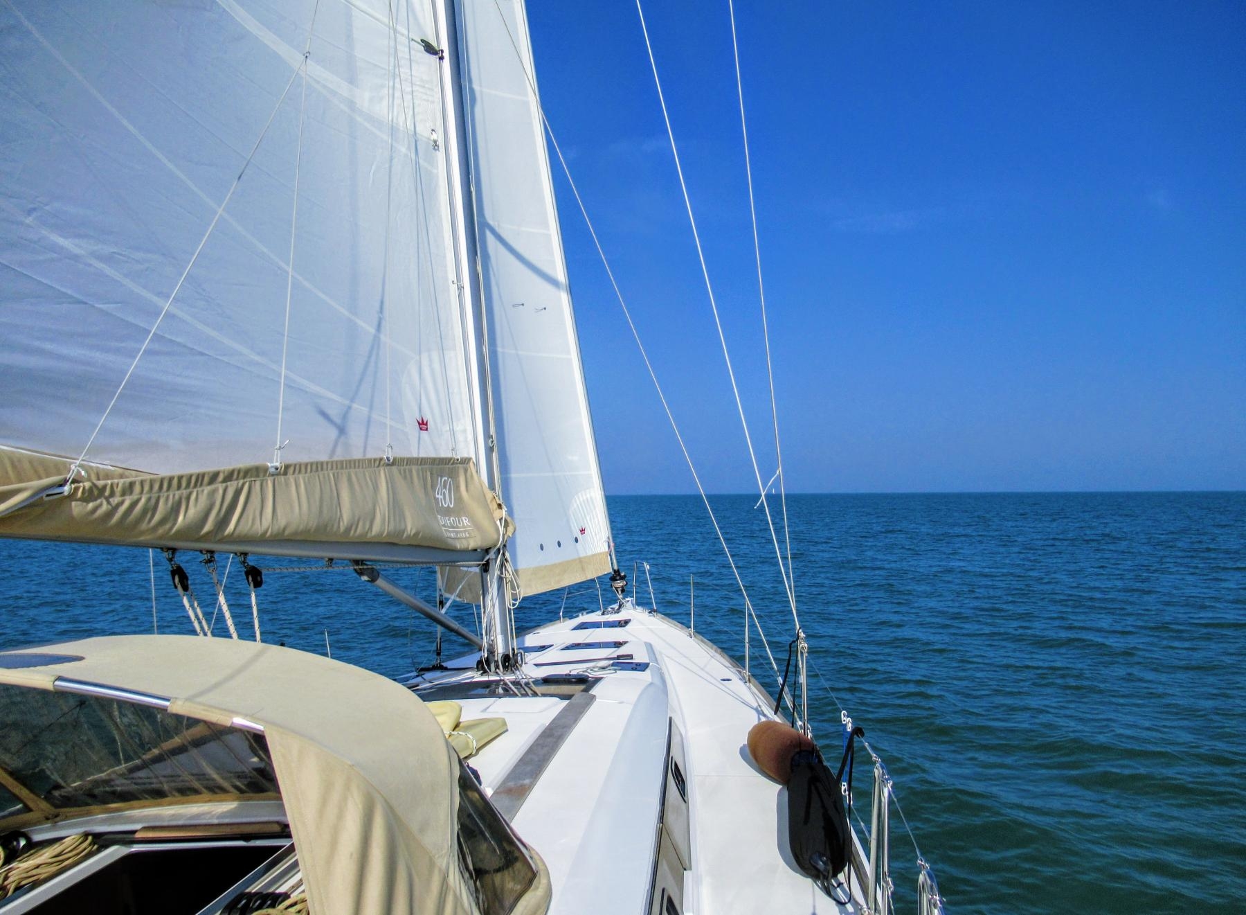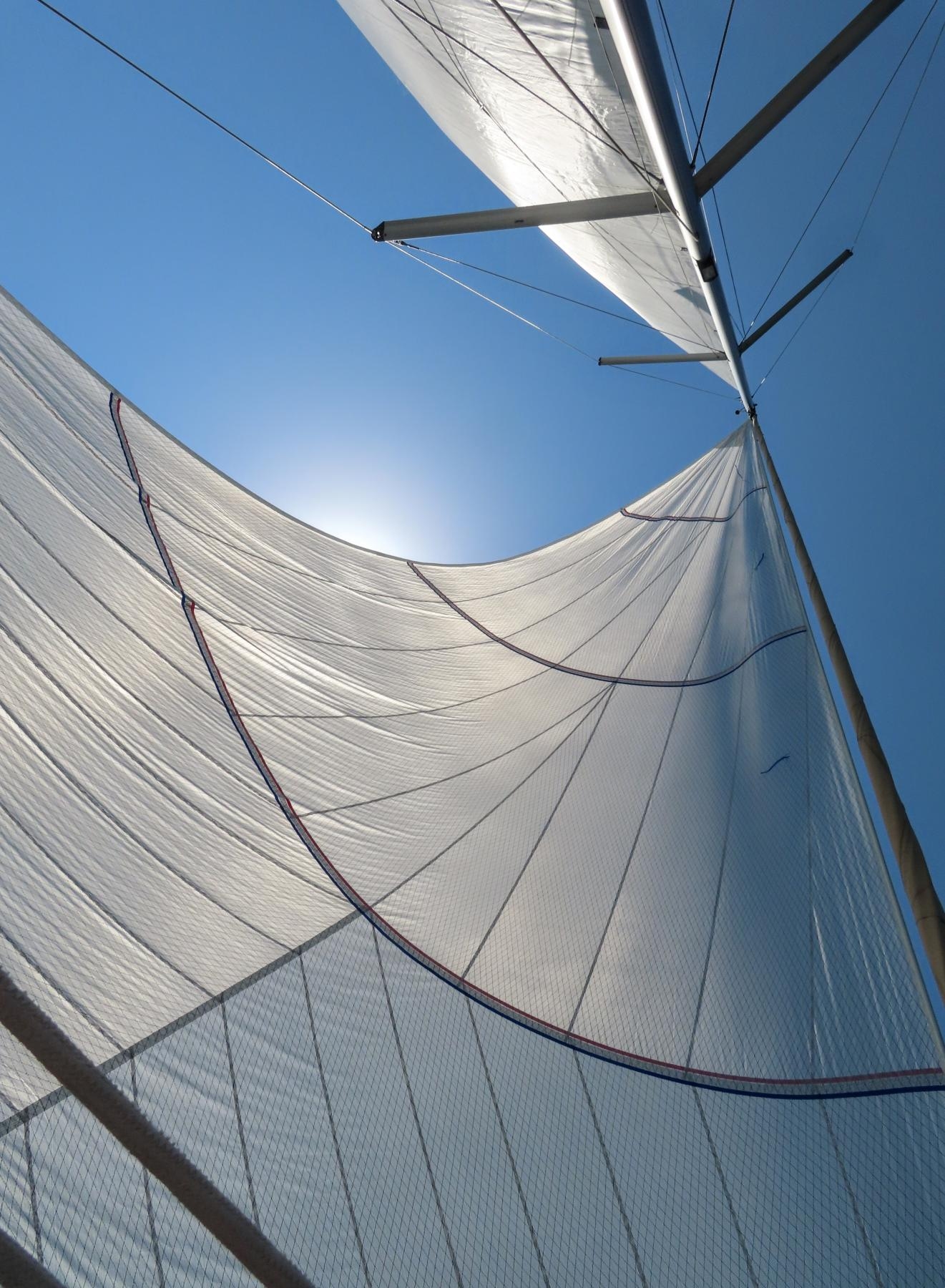 Durchgelattetes Großsegel, Rollgenua, Automatische Reffpunkte im Cockpit, Lazy Bag, Lazy Jacks, Verstellbare Schienen und Rollschlitten
