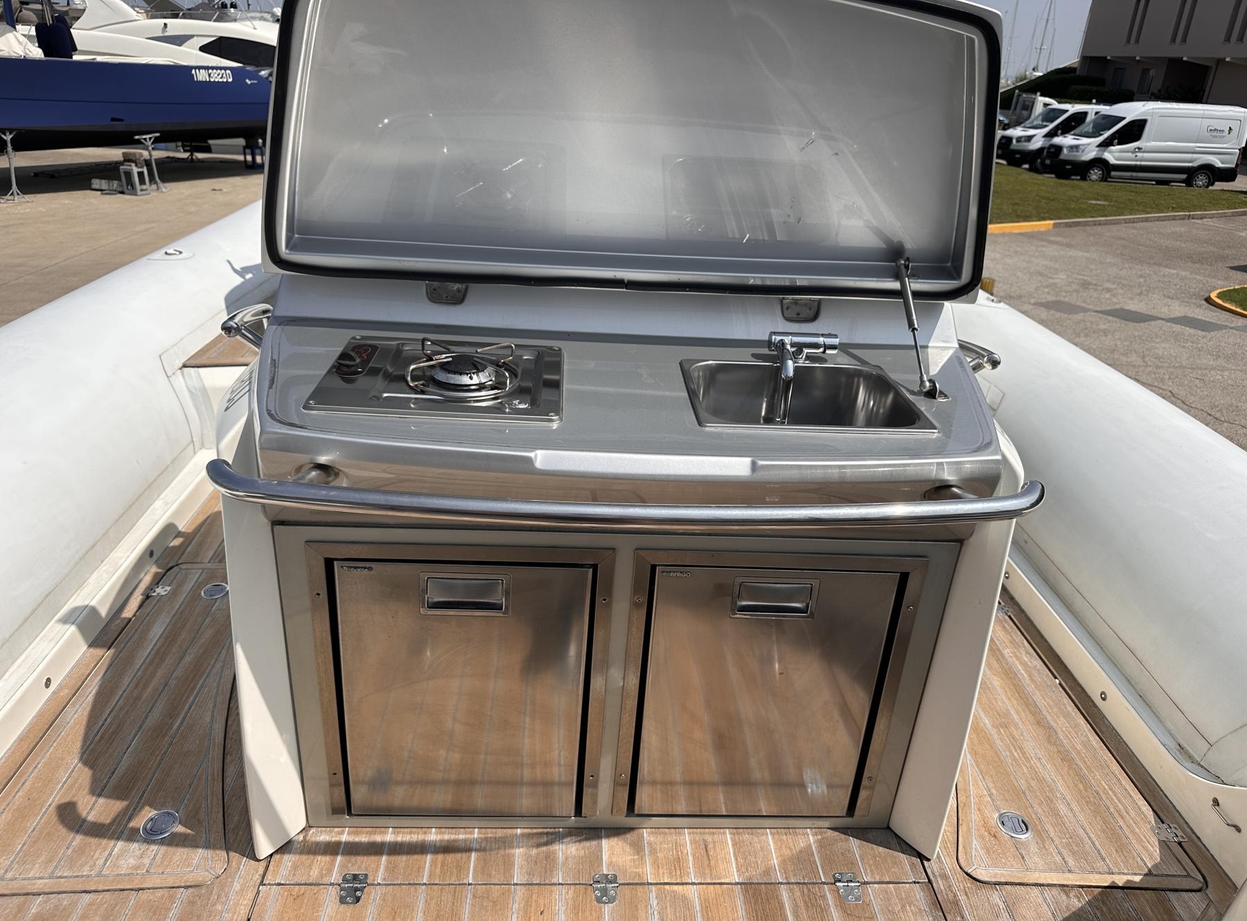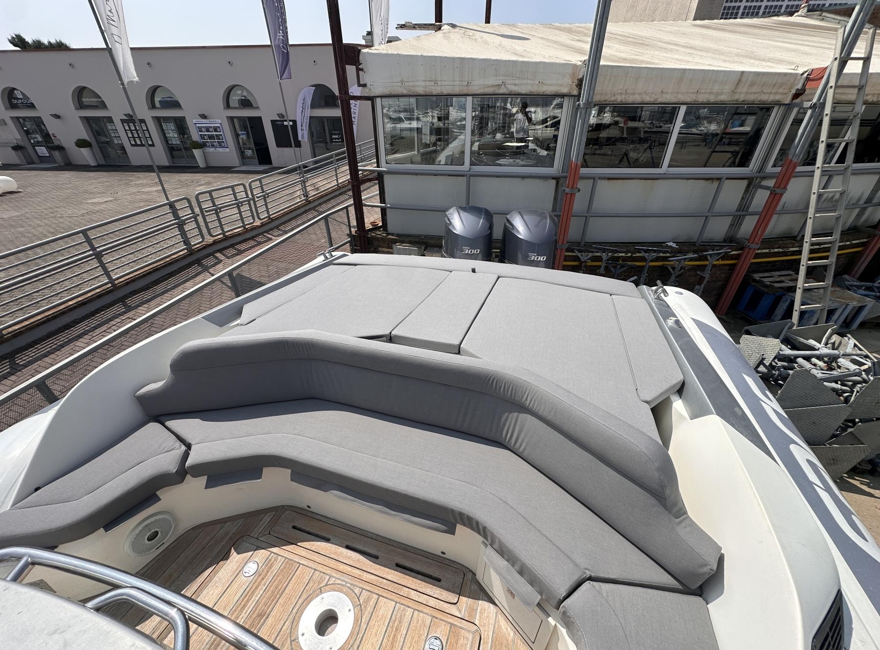 Pozzetto in teak, Passavanti in teak, Scaletta bagno in acciaio inox, Tavolo in pozzetto, Lettini prendisole in pozzetto, Altoparlanti in pozzetto per radio CD, Doccia in pozzetto, Cuscineria esterna (2025), Frigo in pozzetto (2x)