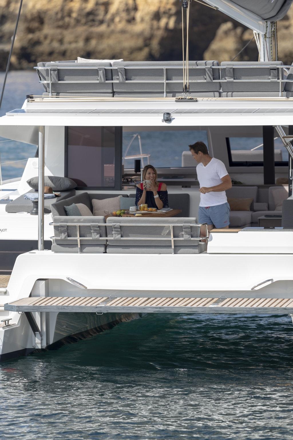 Wich manuali (1), Winch elettrici (2 ), Stopper, Terzaroli, Salpaancore (Elettrico 1500W con contacatena in timoneria), Scaletta bagno in acciaio inox, Tavolo in pozzetto, Doccia in pozzetto, Mancorrente accesso, Bitte ormeggio aggiuntive, Sedute pulpiti, Cuscineria esterna (prua, fly e pozzetto), Tappezzeria esterna (color Flanelle e PVC beige/Nero), Protezioni per specchi di poppa, Piattaforma idraulica tender-lift