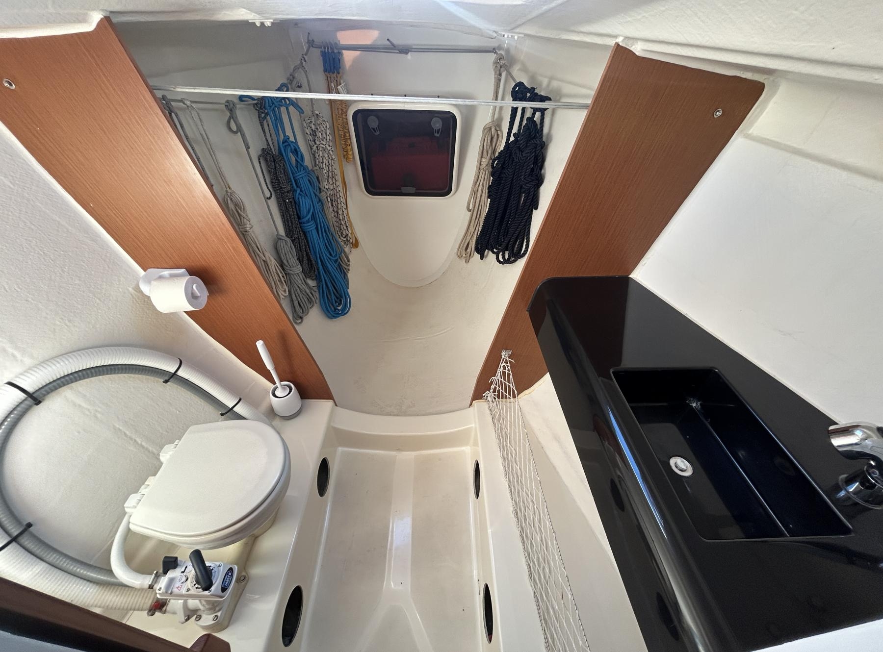 Comfort a Bordo: Nonostante l'anima da regata, gli interni sono sorprendentemente funzionali e accoglienti, pensati per la lunga permanenza a bordo. Dispone di due cabine doppie a poppa, bagno separato, cucina completa (fornello e frigorifero a pozzetto) e tavolo da carteggio.